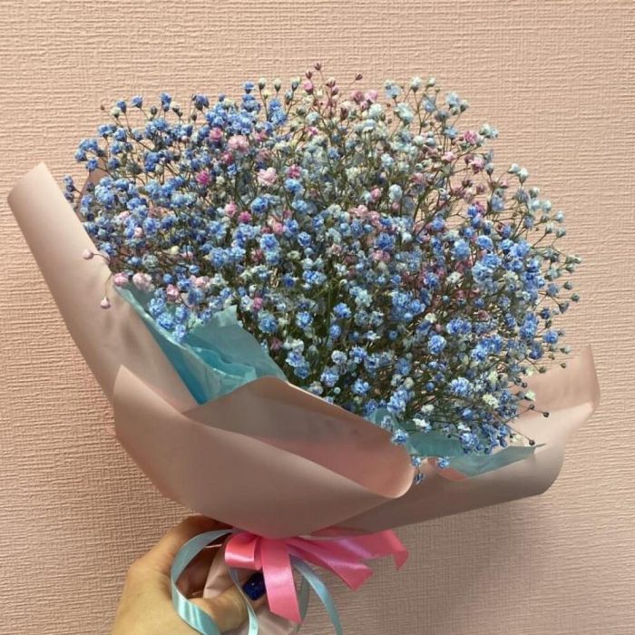 Упаковка – 2 шт.Лента атласная – 2 шт.гипсофила радужная – 5 шт.