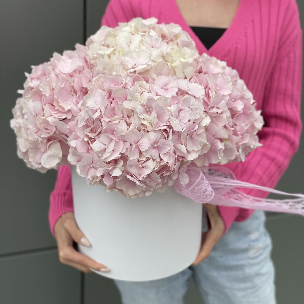 Оазис – 4 шт. Коробка – 1 шт. Оформление – 1 шт. Гортензия розовая – 5 шт.