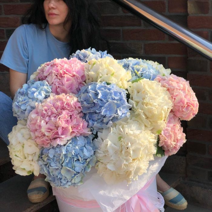 Тишью – 4 шт.Коробка шляпная – 1 шт.Флористическая губка (оазис) – 5 шт.лента премиум – 4 шт.гортензия голландия микс – 21 шт.