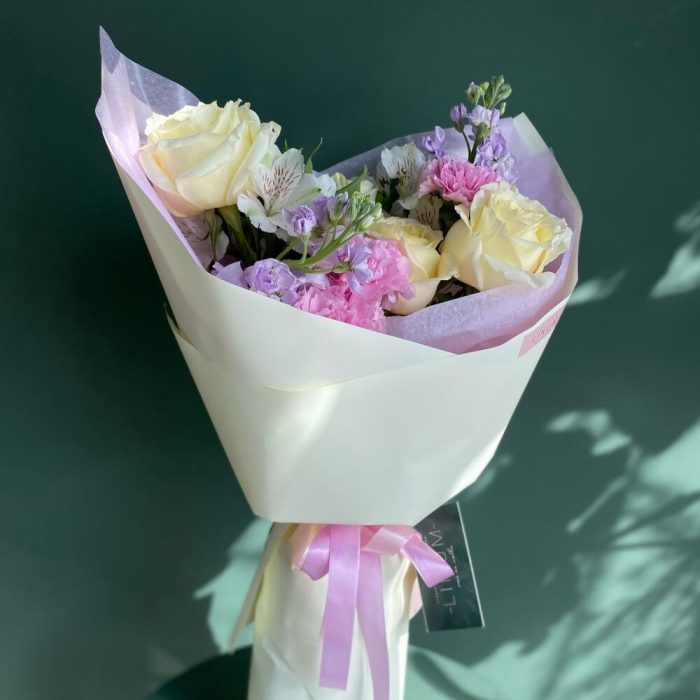роза кендилайт – 4 шт.Маттиола – 4 шт.Гвоздика – 3 шт.Альстромерия – 2 шт.Упаковка дизайнерская – 1 шт.Открыточка с вашими пожеланиями – 1 шт.транспортировочная упаковка – 1 шт.уходовое средство для цветов – 1 шт.