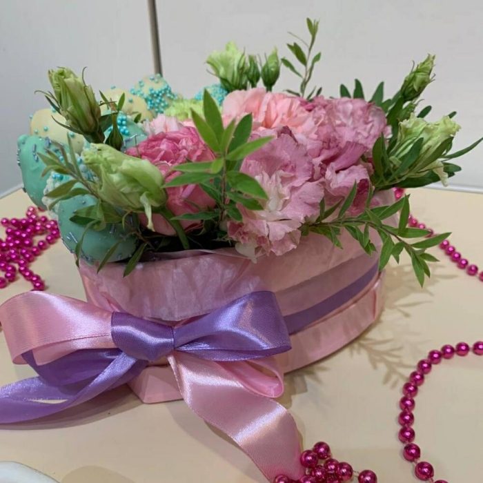 Букет ” Сердце счастья” из клубники в шоколаде с цветами