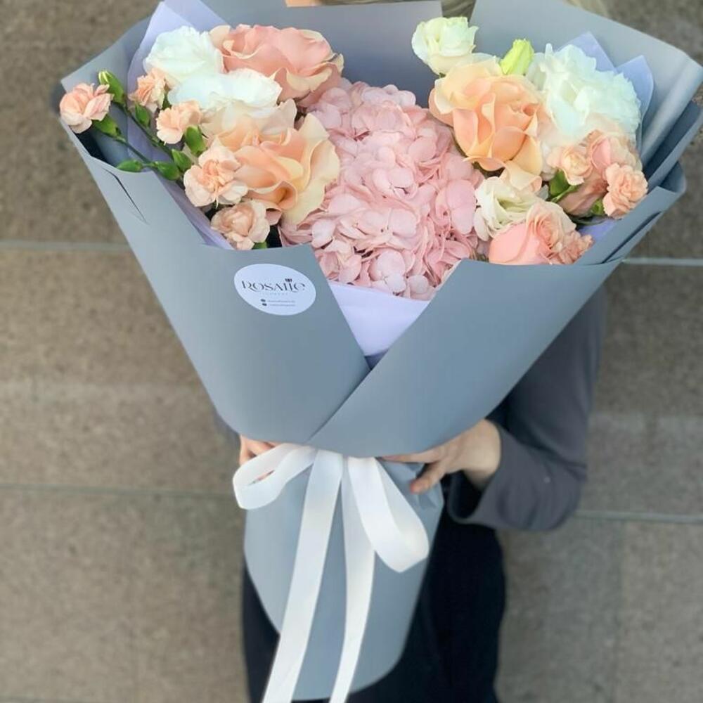 Альстромерии, Гвоздики, Кустовые розы, Лизиантусы, Розы, Хризантемы
