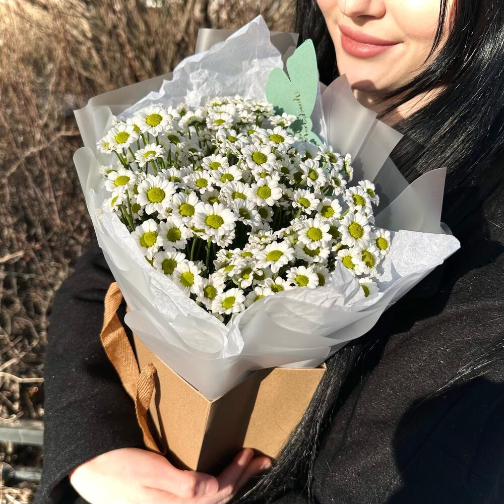 Нежный букет из 7 веточек белоснежных сантиний. Стильная упаковка из мятого тишью и полупрозрачной пленки придает цветам еще больше нежности и воздушности. Крафтовый пакет очень удобен при транспортировке букета.В подарок к заказу прилагается: Открытка бабочка – передаст … Показать ещёваши послания(поздравления) получателю и подарит еще больше летнего настроения