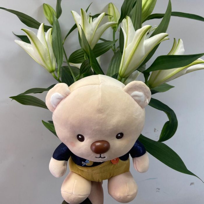 Лилия белая (голландия) – 3 шт.Атласная лента – 1 шт.Упаковка прозрачная – 1 шт.Игрушка – 1 шт.