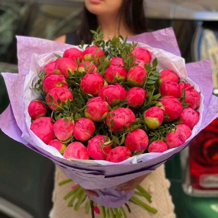 35 коралловых пионов с зеленью и оформлением