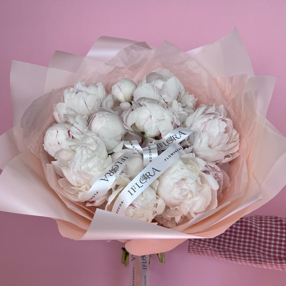 Пион – 15 шт.Лента атласная – 3 шт.Дизайнерская упаковка – 1 шт.