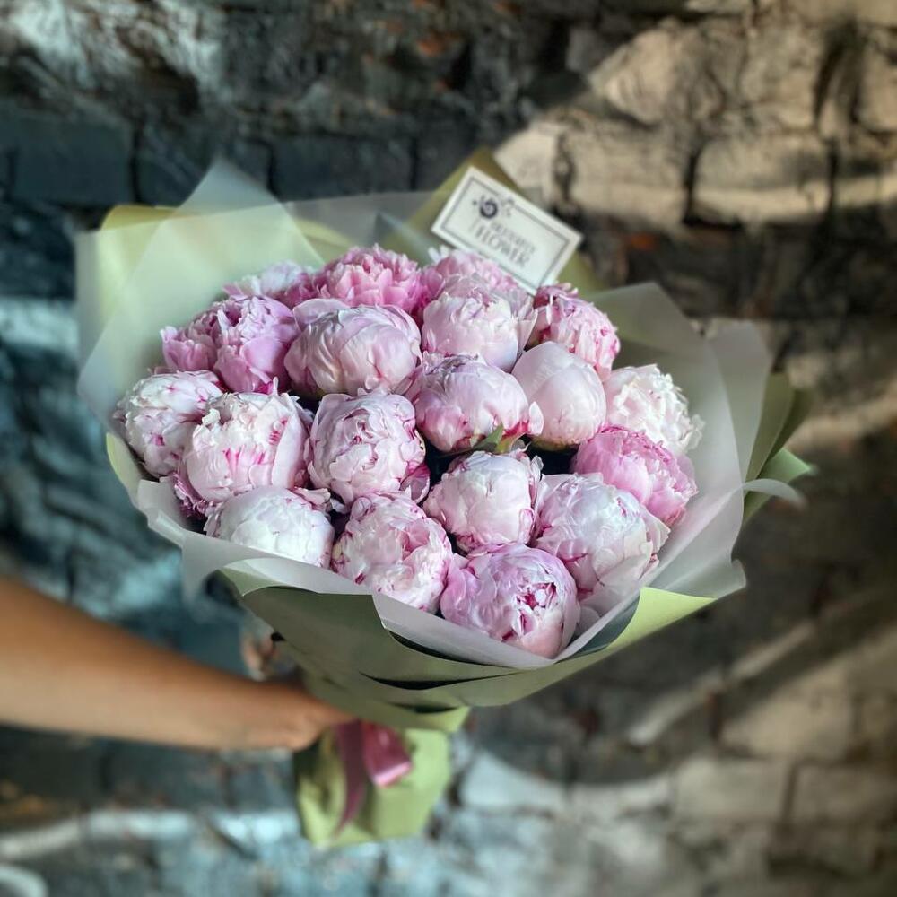 Букет из 19 розовых пионов в дизайнерской упаковке “Джордж Сайрус”