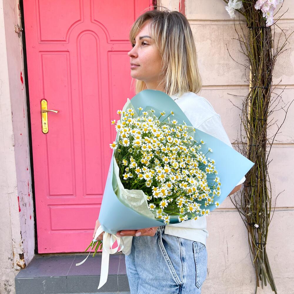 Лента атласная – 1 шт.Тишью – 2 шт.Аквапак – 1 шт.Матрикария (Ромашка Камила) – 15 шт.Корейская пленка – 3 шт.