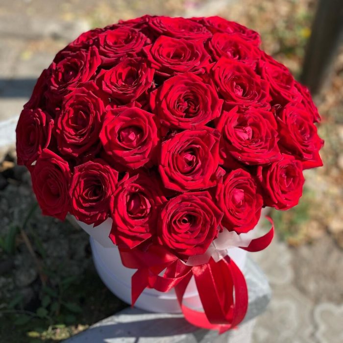 Лента – 1 шт.Роза – 31 шт.Коробка шляпная – 1 шт.Оазис флористический – 2 шт.
