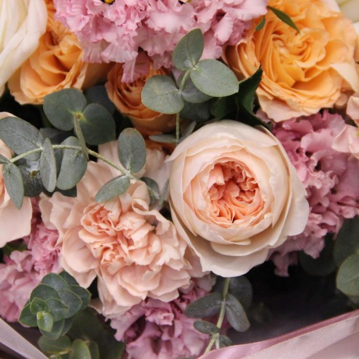 Маттиола – 7 шт.Лизиантус – 7 шт.Роза кустовая пионовидная – 3 шт.Роза пионовидная – 9 шт.Диантус – 9 шт.Эвкалипт – 9 шт.Фисташка – 5 шт.Тишью – 3 шт.Бумага – 3 шт.Лента атласная – 3 шт.