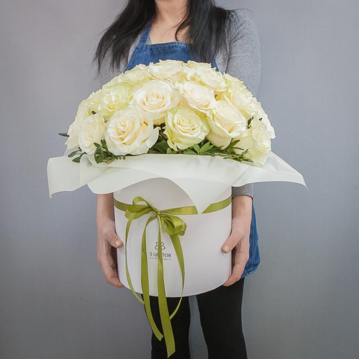 Букет 25 белых роз в шляпной коробке