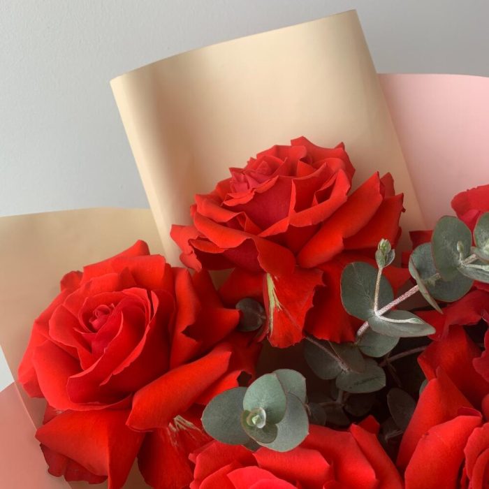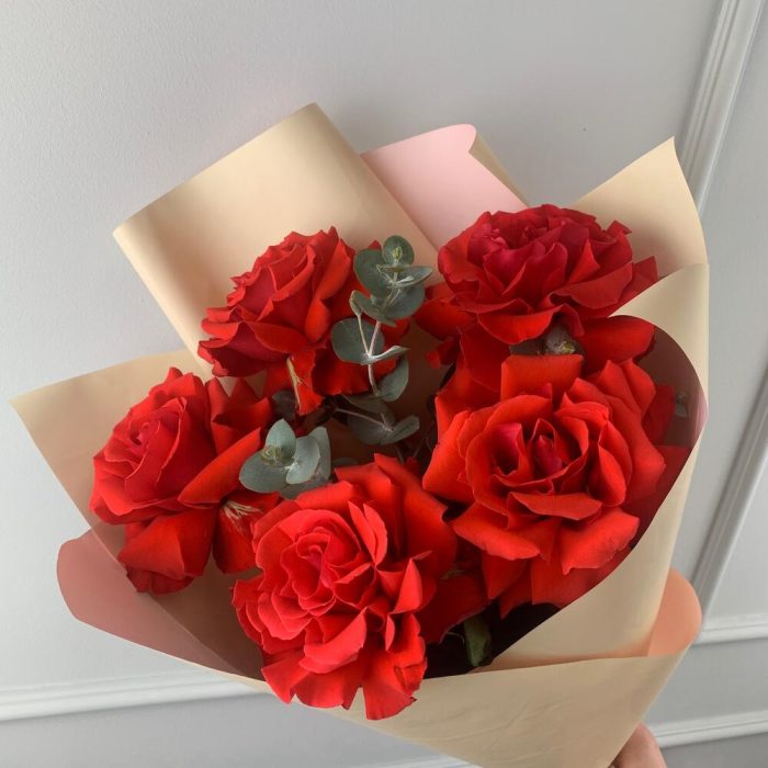 Роза Эквадор – 5 шт.Эвкалипт – 1 шт.Пленка матовая – 1 шт.Лента – 1 шт.