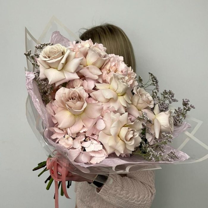 Гортензия – 2 шт.Лимониум – 2 шт.Роза – 7 шт.Упаковка дизайнерская – 4 шт.