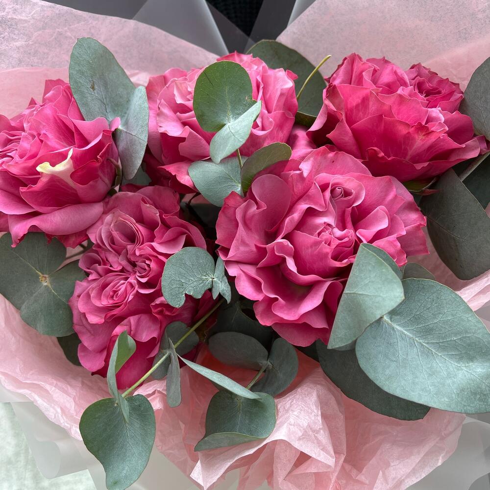 Роза пионовидная – 5 шт.Эвкалипт – 1 шт.Лента – 2 шт.Упаковка дизайнерская – 2 шт.