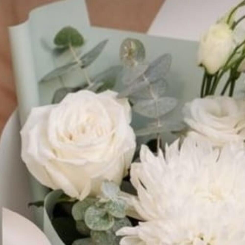 Хризантема – 1 шт.Роза – 1 шт.Эустома – 1 шт.Упаковка дизайнерская – 5 шт.Лента атласная – 2 шт.зелень декоративная – 2 шт.