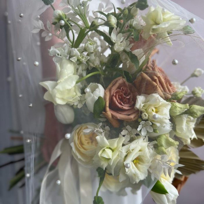 Лизиантус – 2 шт.Маттиола – 3 шт.Тюльпан – 5 шт.Пионовидная роза – 7 шт.Атласная лента – 2 шт.Оксипеталум – 5 шт.рускус сухоцвет – 2 шт.пальмовое копье – 2 шт.японский ранункулюс – 3 шт.