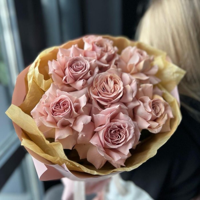 Роза мокко – 7 шт.Дизайнерская упаковка – 1 шт.Лента атласная – 1 шт.