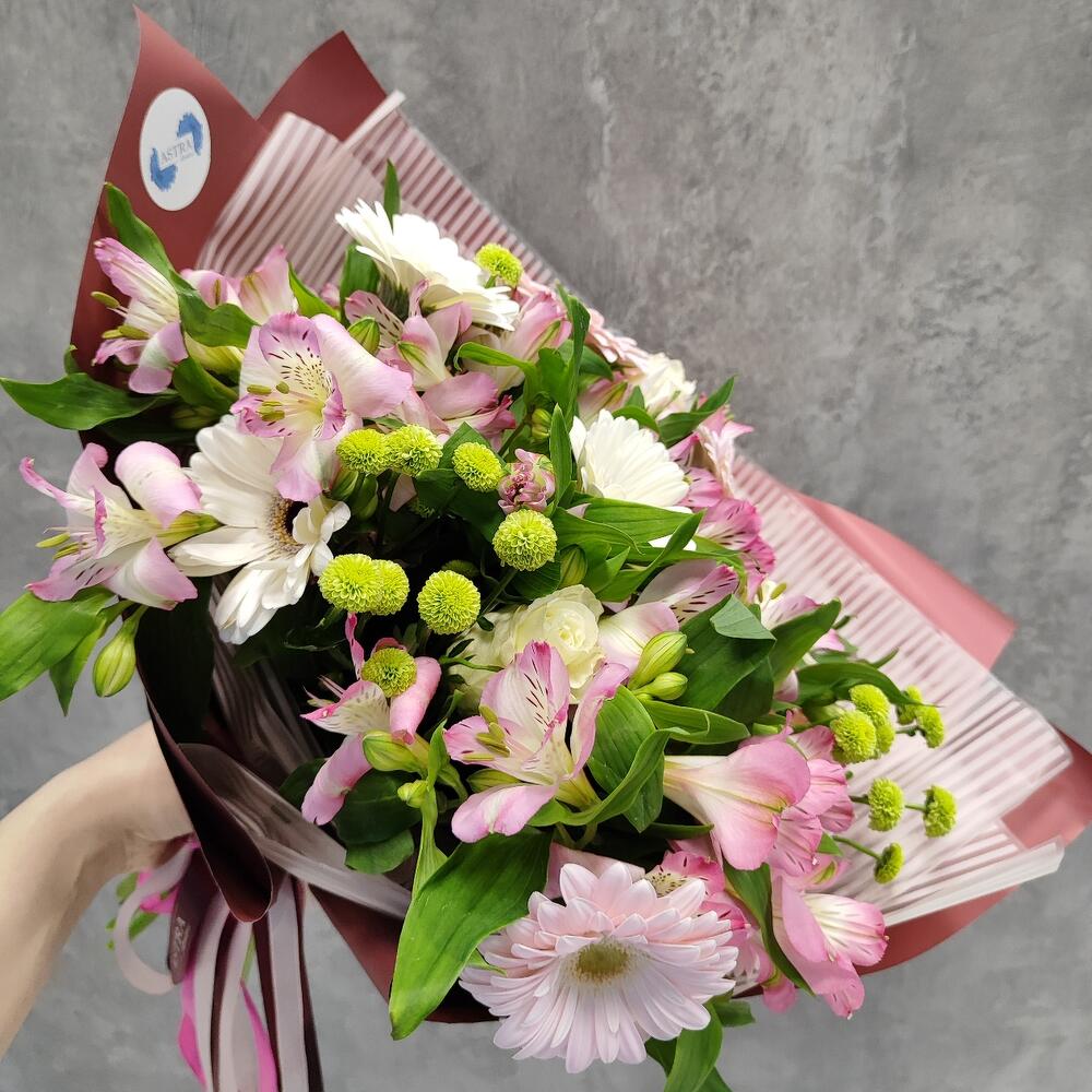 Альстромерия – 7 шт.Гербера – 6 шт.Роза – 3 шт.хризантема кустовая помпон – 3 шт.Авторская упаковка – 1 шт.Атласная лента – 1 шт.