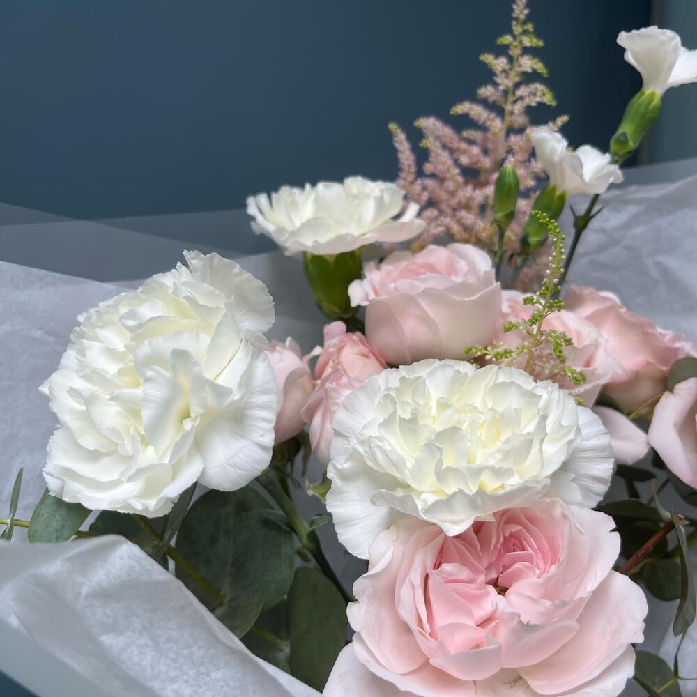 Астильба – 2 шт.Роза кустовая – 2 шт.Эвкалипт – 2 шт.Гвоздика – 3 шт.Лента атласная – 1 шт.Тишью – 1 шт.Кустовая гвоздика – 1 шт.Упаковка дизайнерская – 2 шт.
