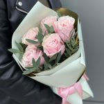 Роза пинк мондиаль – 5 шт. Эвкалипт – 1 шт. Писташ – 2 шт. Оформление – 1 шт.