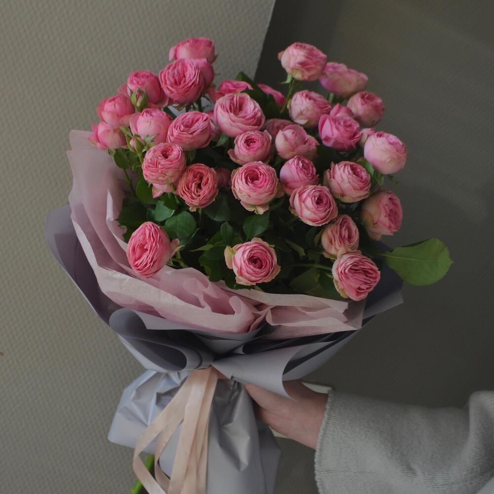 Букет из 9 кустовых пионовидных роз сорта Giselle, упаковка, атласная лента.