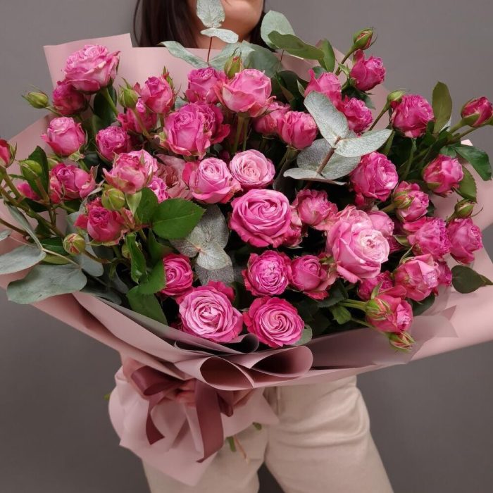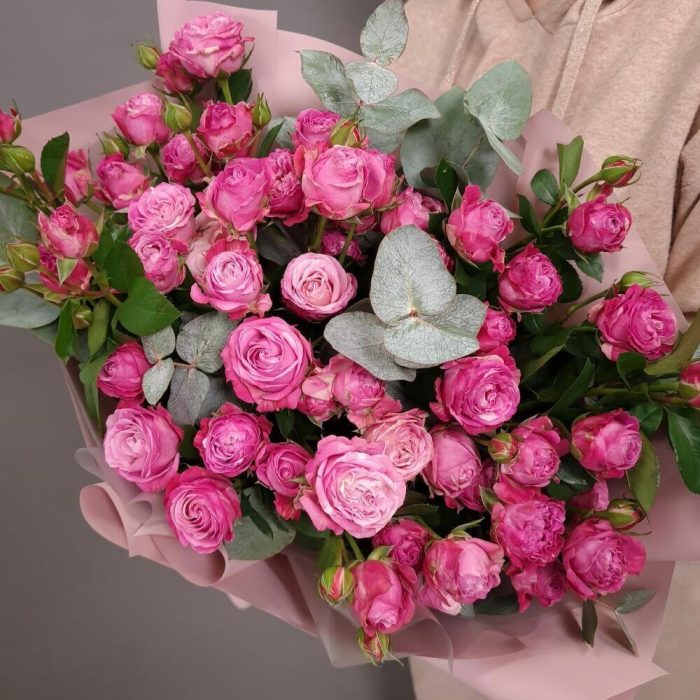 Ярко-розовые стойкие пионовидные кустовые розы Леди Бомбастик и ароматный эвкалипт.