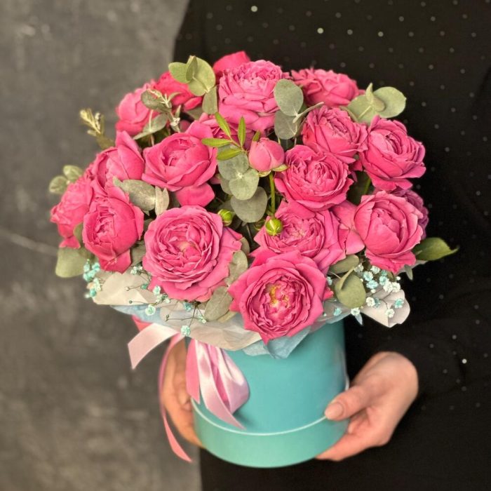 Цветы в коробке кустовые пионовидных розы с эвкалиптом