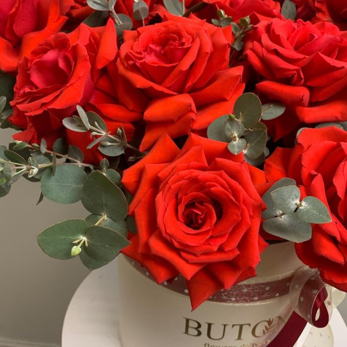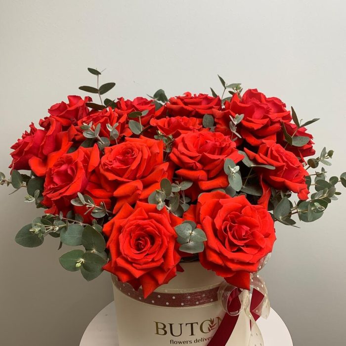 Французские розы в цилиндре с эквалиптом
