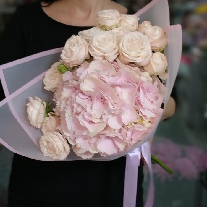 Гортензия – 1 шт.Роза кустовая – 3 шт.Оформление – 1 шт.