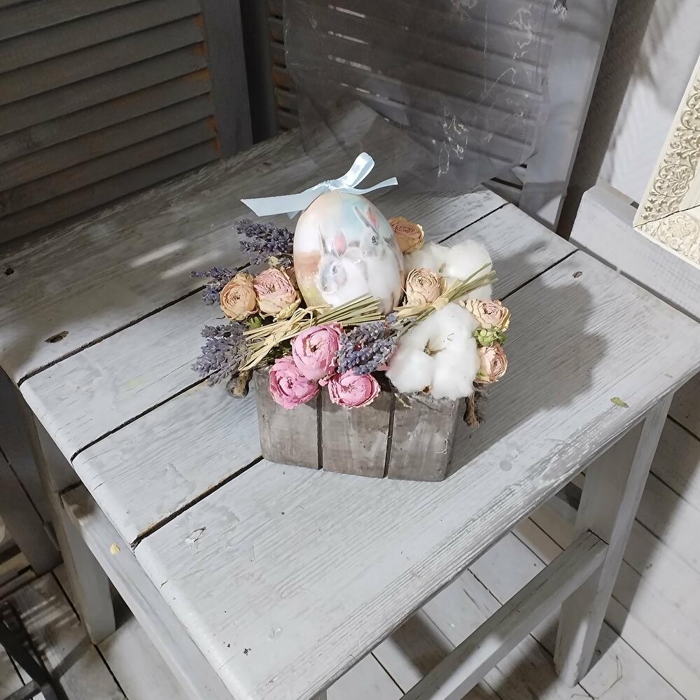 роза засушеная – 15 шт.букетики лаванды натуральной – 4 шт.коробочки хлопка – 2 шт.кашпо деревянное с ручками – 1 шт.яйцо из пластика – 1 шт.бантик атласный – 1 шт.