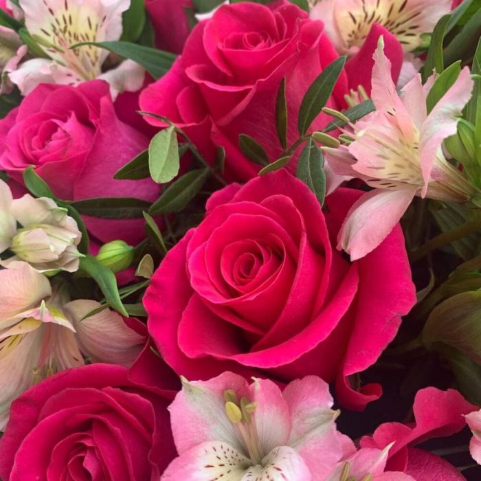 Роза – 25 шт.Альстромерия – 20 шт.Рускус – 15 шт.Оазис флористический – 2 шт.Корзина плетеная – 1 шт.