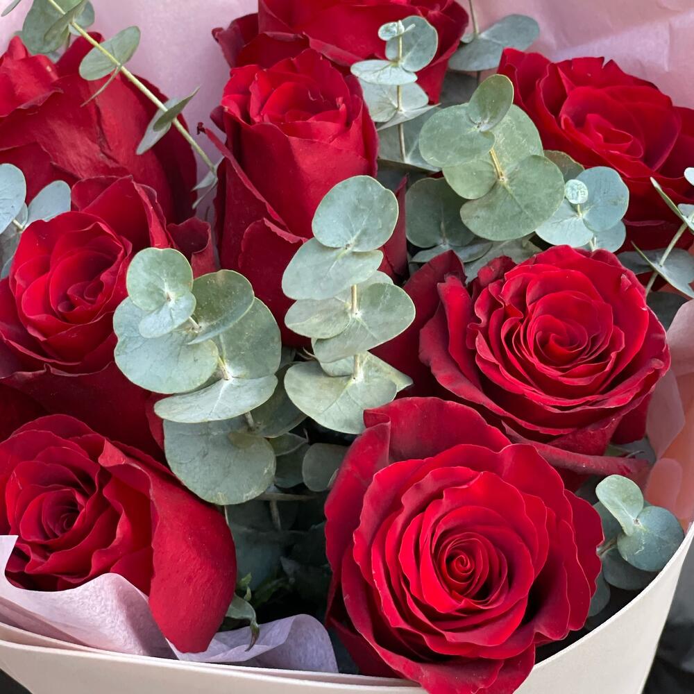 Эвкалипт – 3 шт.Роза Эквадор – 9 шт.Лента атласная – 1 шт.Тишью – 2 шт.Фоамиран (упаковка) – 1 шт.
