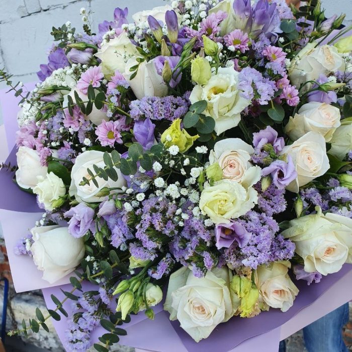 Гипсофила – 5 шт.Эвкалипт – 5 шт.Зелень – 25 шт.Упаковка дизайнерская – 5 шт.Роза Охара – 25 шт.Сантини розовая – 6 шт.Статица лиловая – 5 шт.Фрезия лиловая – 6 шт.