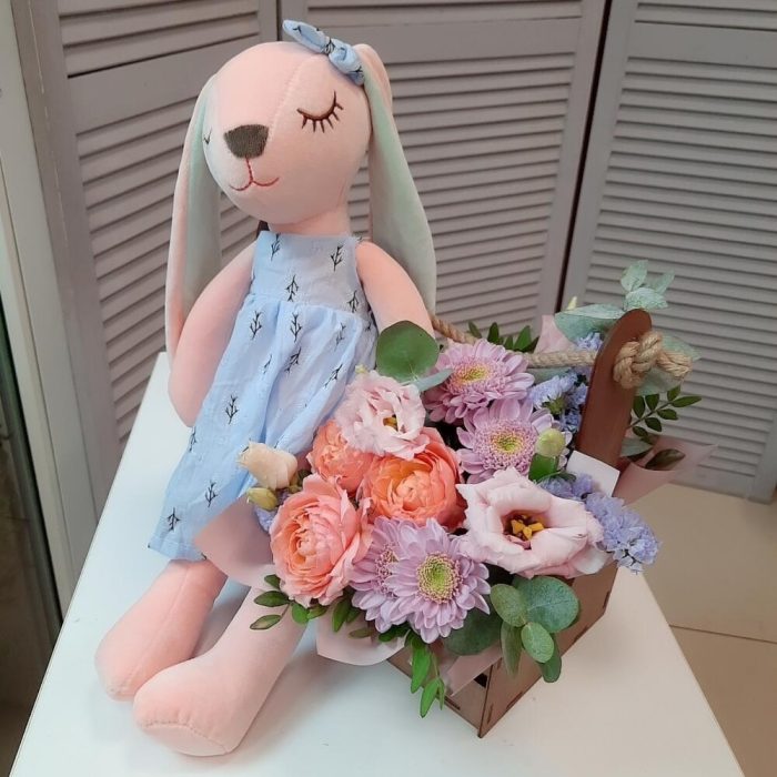 Статица – 1 шт.Хризантема кустовая – 1 шт.Эустома – 1 шт.Роза пионовидная кустовая – 1 шт.Ящик деревянный подарочный – 1 шт.Губка флористическая – 1 шт.зелень декоративная – 7 шт.зайка плюшевый 45 см – 1 шт.