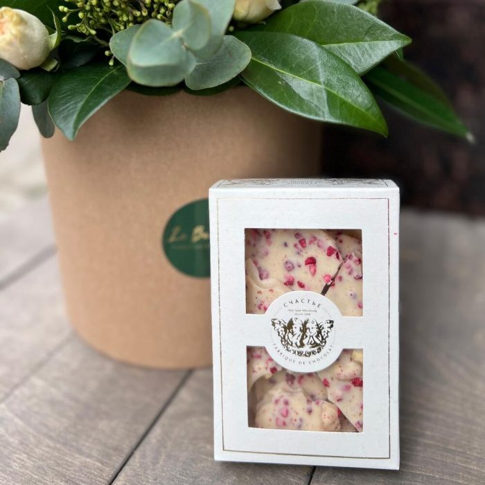 “Атлас☁️” – цветочная композиция с зефиром в деревянном ящике
