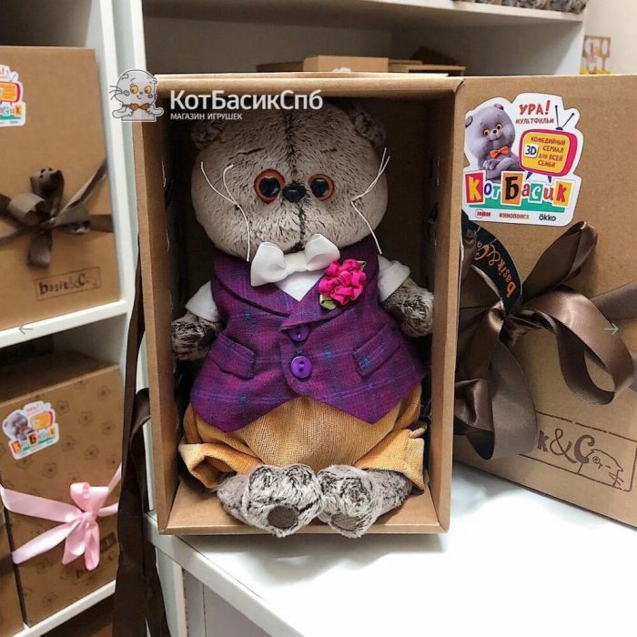 Мягкая игрушка в коробке Кот Басик в бордовом жилете с розочкой 19см (сидя)