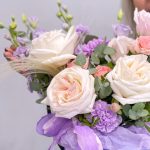 Нежная композиция, в составе которой ароматные Пионовидные розы Вайт Охара, маттиола, фиолетовые гвоздики и лизиантус порадуют как нежную романтичную девушку, так и взрослую женщину