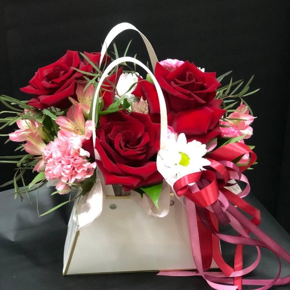 Альстромерия – 1 шт.Рускус – 4 шт.Хризантема кустовая – 1 шт.Роза – 3 шт.Лента атласная – 4 шт.Диантус – 3 шт.Сумочка – 1 шт.Оазис флористический – 1 шт.эвкалипта – 1 шт.
