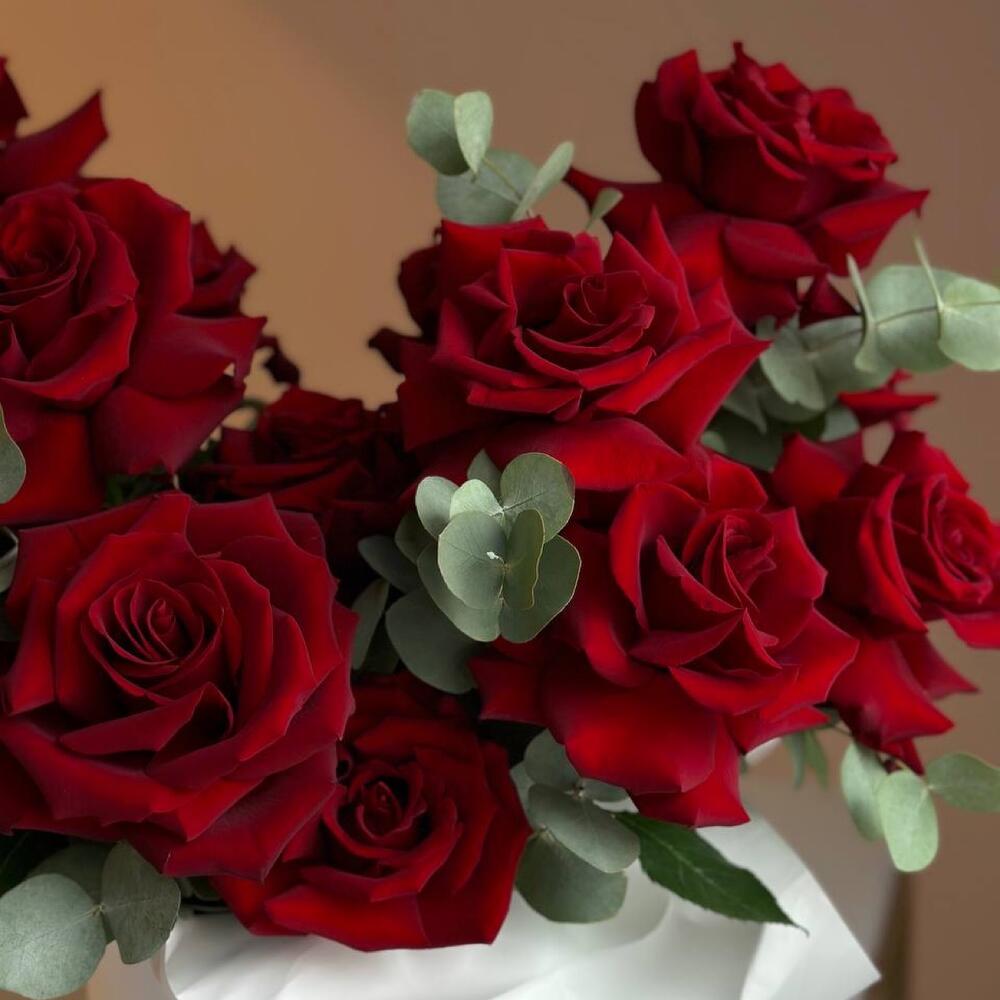 Роза красная Эквадор – 15 шт.Эвкалипт – 2 шт.Фисташка – 2 шт.Шляпная коробка – 1 шт.Флористическая губка (оазис) – 1 шт.