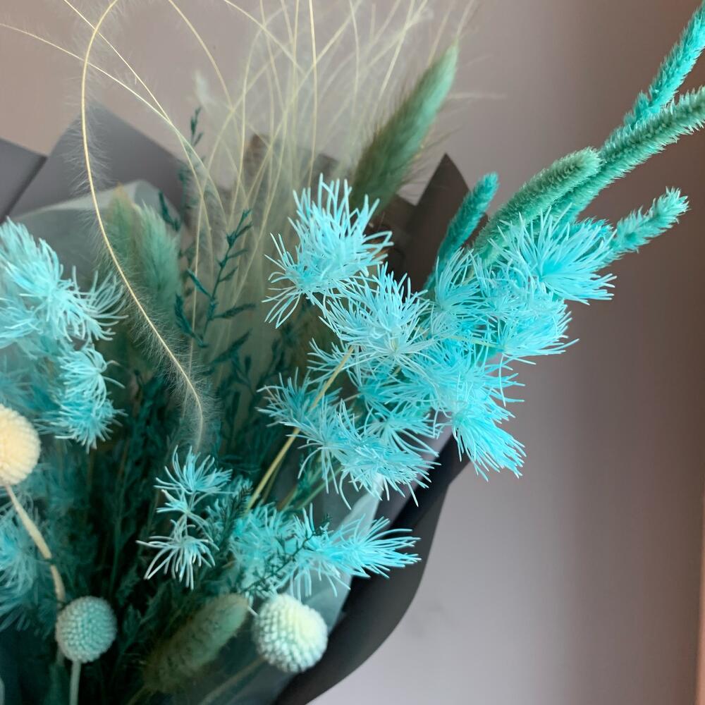 Краспедия – 3 шт.Аспарагус – 5 шт.Стифа – 3 шт.Лагурус – 4 шт.Флум – 2 шт.кортадерия – 1 шт.Упаковка дизайнерская – 1 шт.