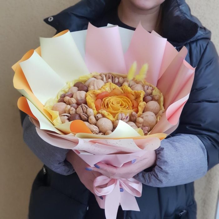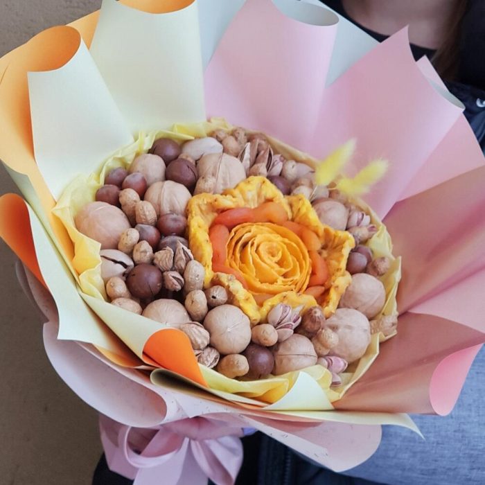 манго вяленое – 95 гр.Курага – 60 гр.ананас вяленый – 75 гр.Орех грецкий – 150 гр.Орех пекан – 30 гр.миндаль в скорлупе – 30 гр.макадамия – 30 гр.фундук в скорлупе – 25 гр.арахис в скорлупе – 50 гр.Фисташки – 12 гр.Лагурус (сухоцвет) – 2 шт.